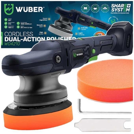 WUBER 20V belaidis orbitinis poliruoklis. Pasiekite profesionalų veidrodinį paviršių be jokios žalos rizikos dėka dvigubo veikimo technologijos, kuri sujungia sukamąjį