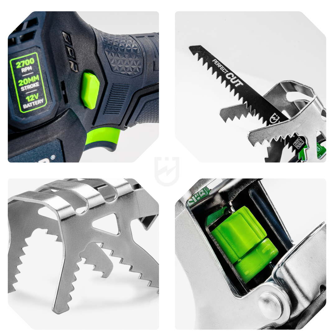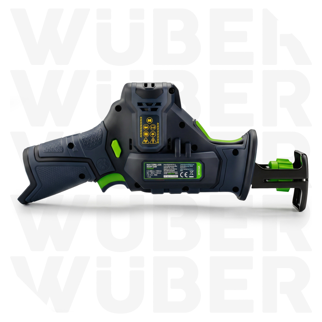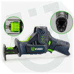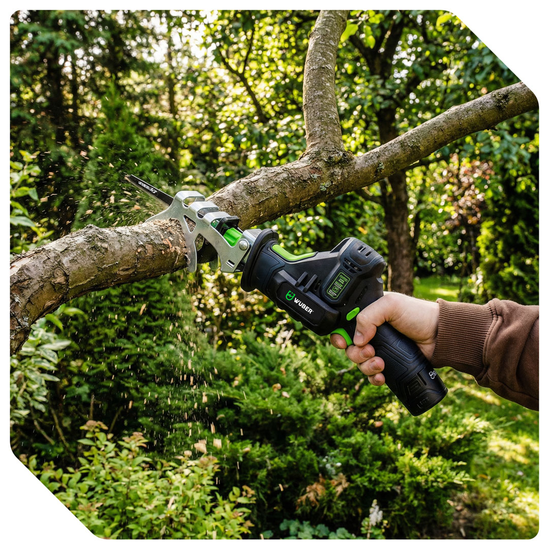 WUBER 12 V akumuliatorinis tiesinis pjūklas su šakų atramos sistema.
