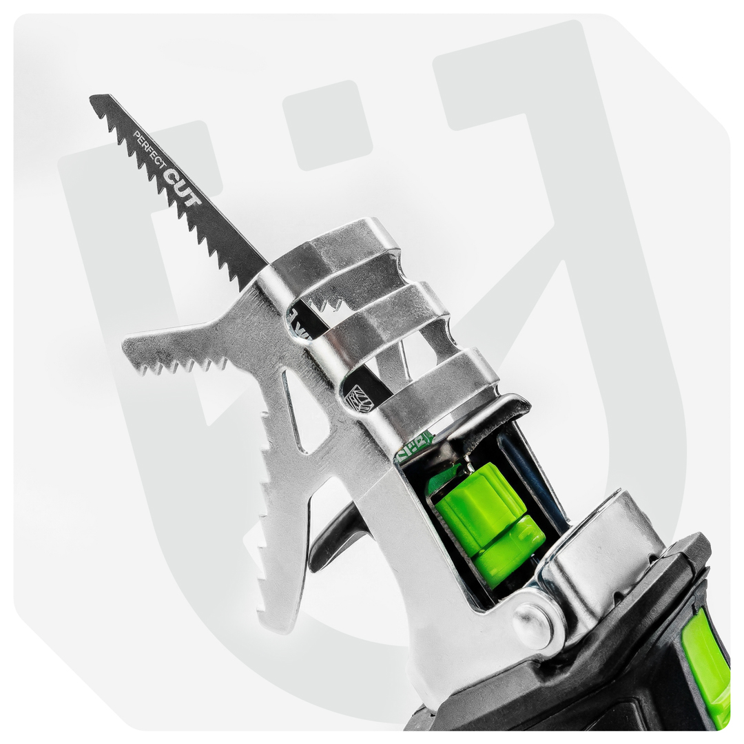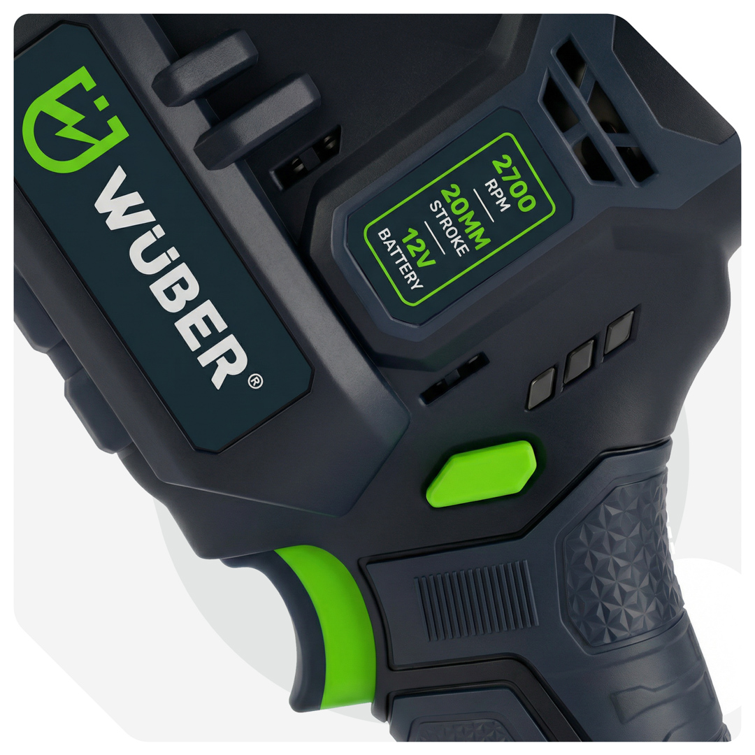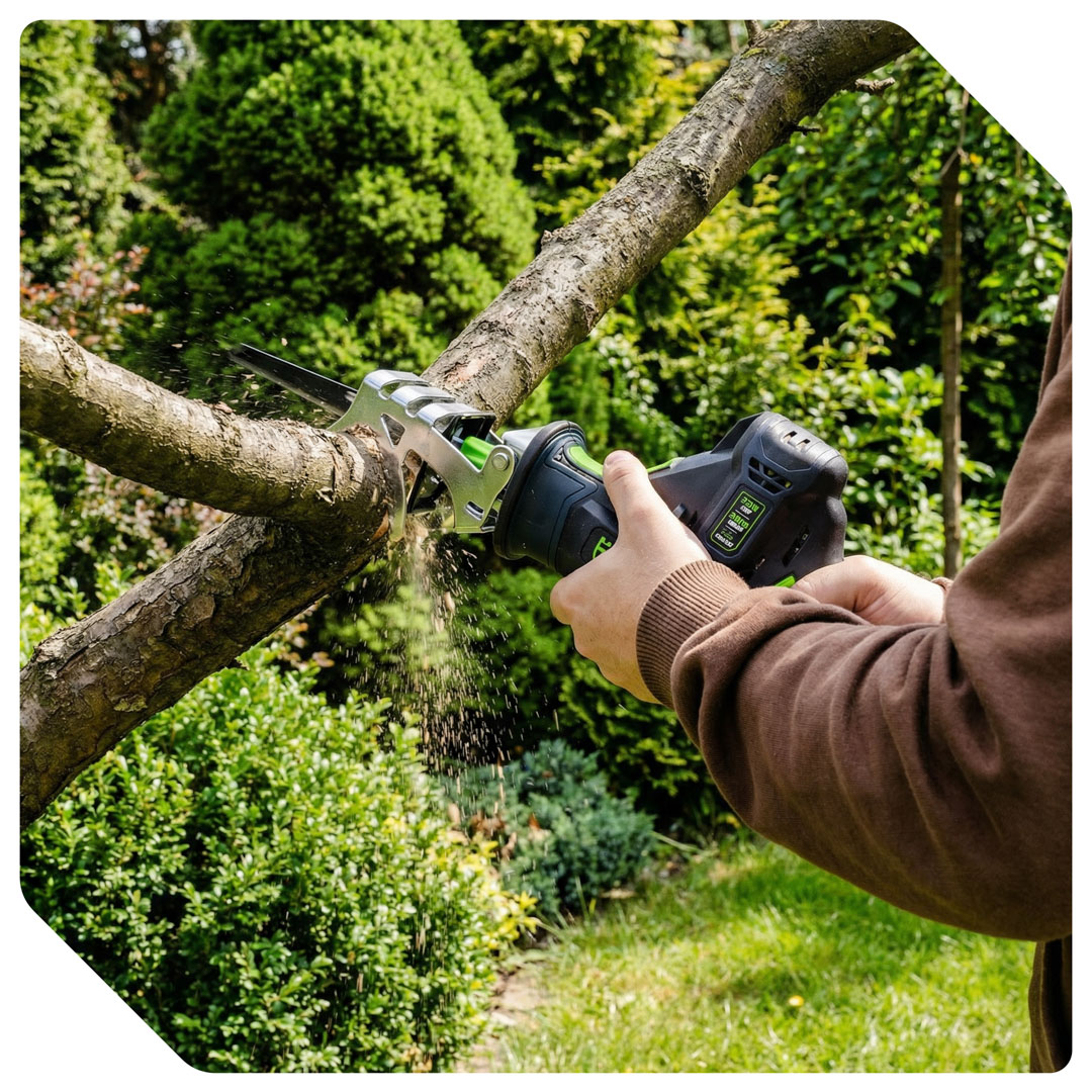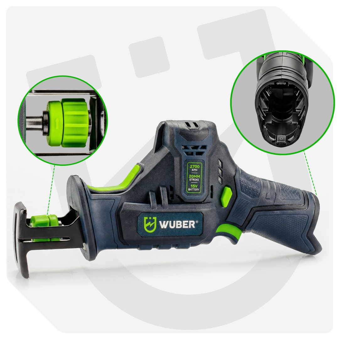 WUBER 12 V akumuliatorinis tiesinis pjūklas su šakų atramos sistema.