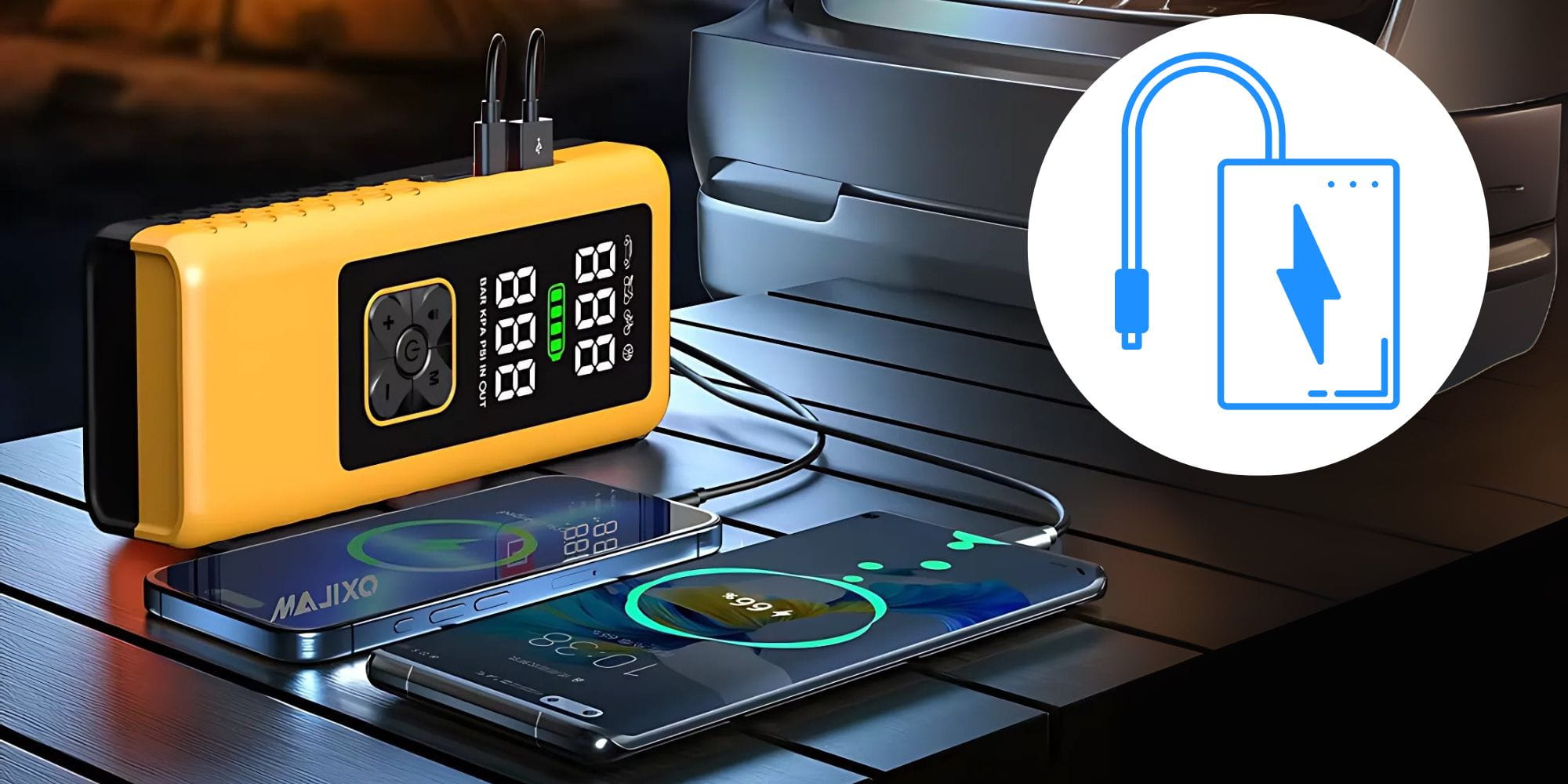 4 viename: užvedimo įrenginys, įkroviklis, kompresorius, išorinė baterija – sutaupysite vietos ir pinigų