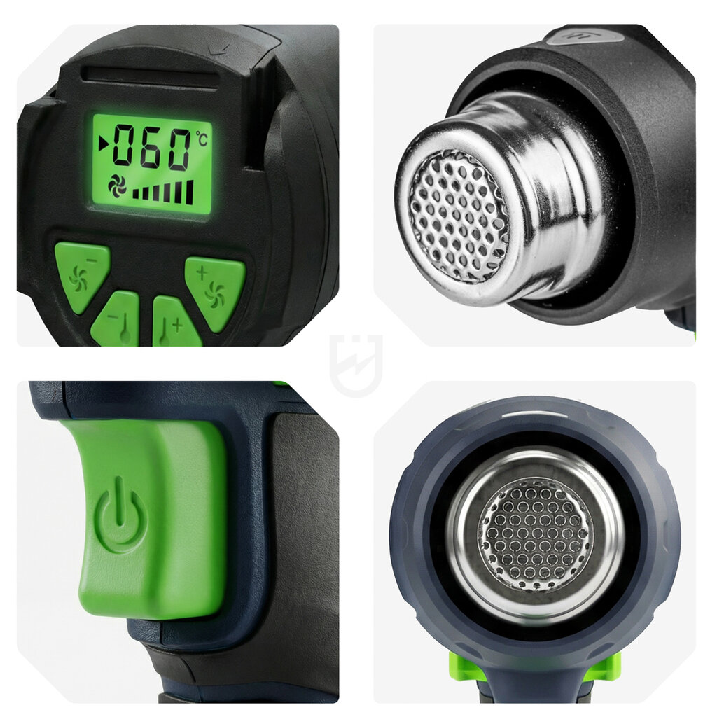 Aiškus LCD ekranas leidžia tiksliai reguliuoti parametrus, skirtus senoms dangoms pašalinti, izoliacijai susitraukti arba plastikui lenkti.