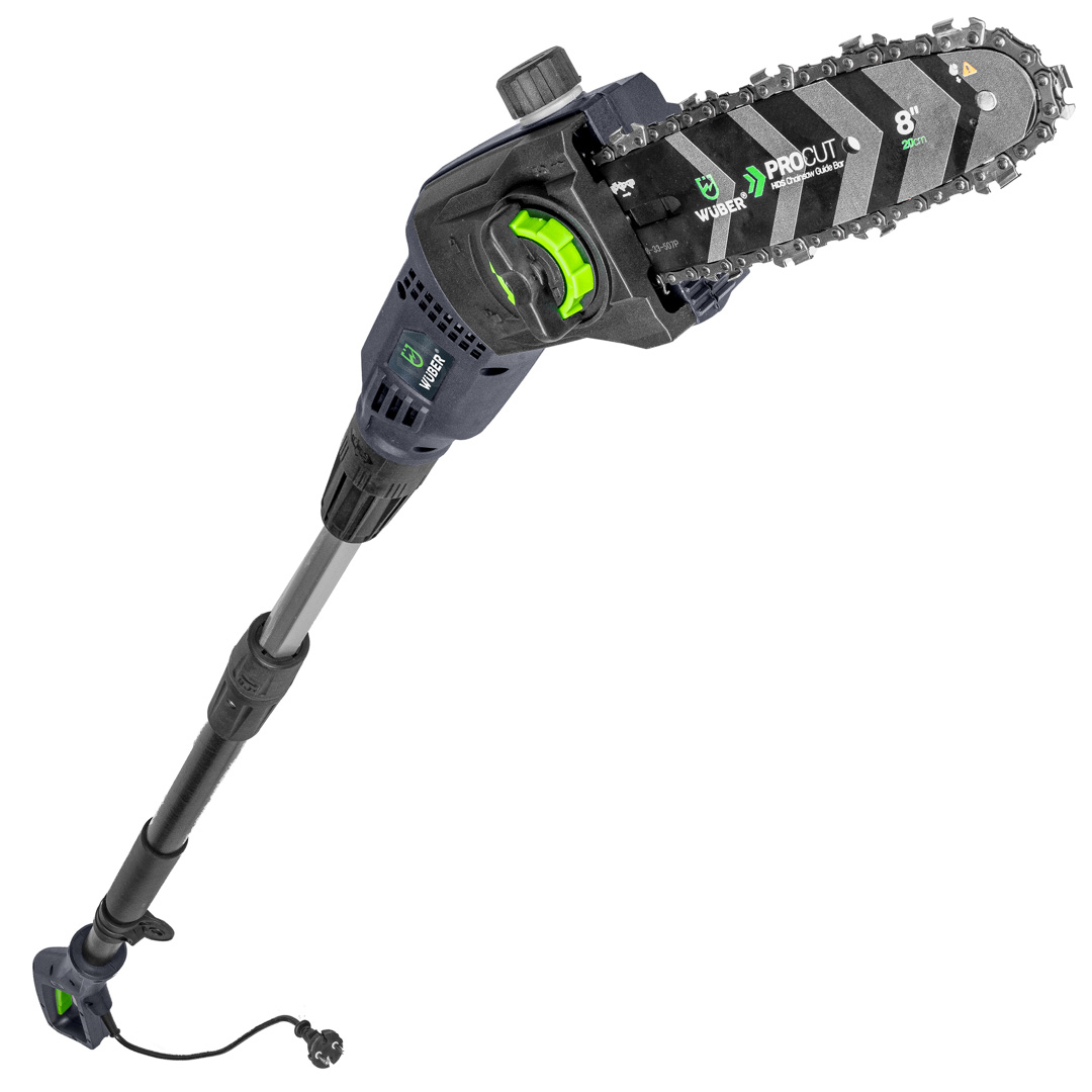Elektrinis grandininis pjūklas Wuber W37020 – patikimas ir galingas įrankis, skirtas medžių priežiūrai bei sodo darbams. Dėl rankenos (170–230 cm) galima saugiai pasiekti aukštas šakas be kopėčių, o 800 W galia ir 12 m/s grandinės greitis užtikrina našų pjovimą.