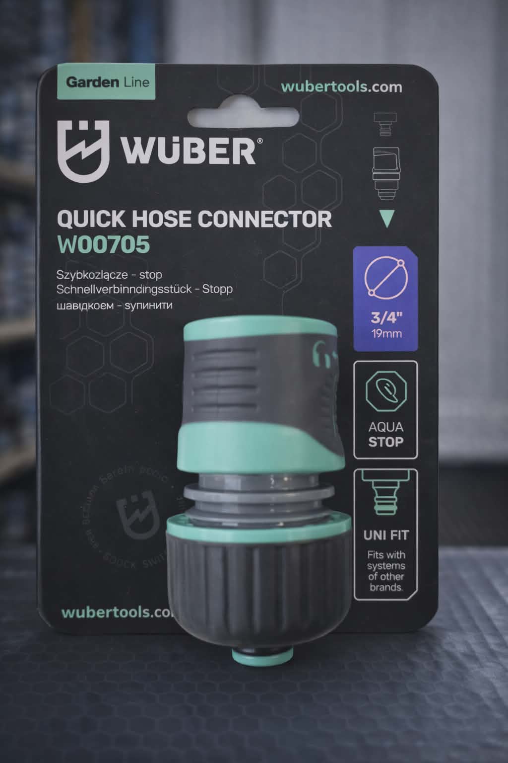 Greito jungimo žarnos jungtis WUBER W00705 su „Aqua Stop“ funkcija – leidžia atjungti įrankius nenutraukiant vandens tiekimo. Tinka 3/4” (19 mm) žarnoms, užtikrina sandarų sujungimą ir patogų naudojimą. „Soft grip“ paviršius ir „UNI FIT“ suderinamumas su dauguma laistymo sistemų.
