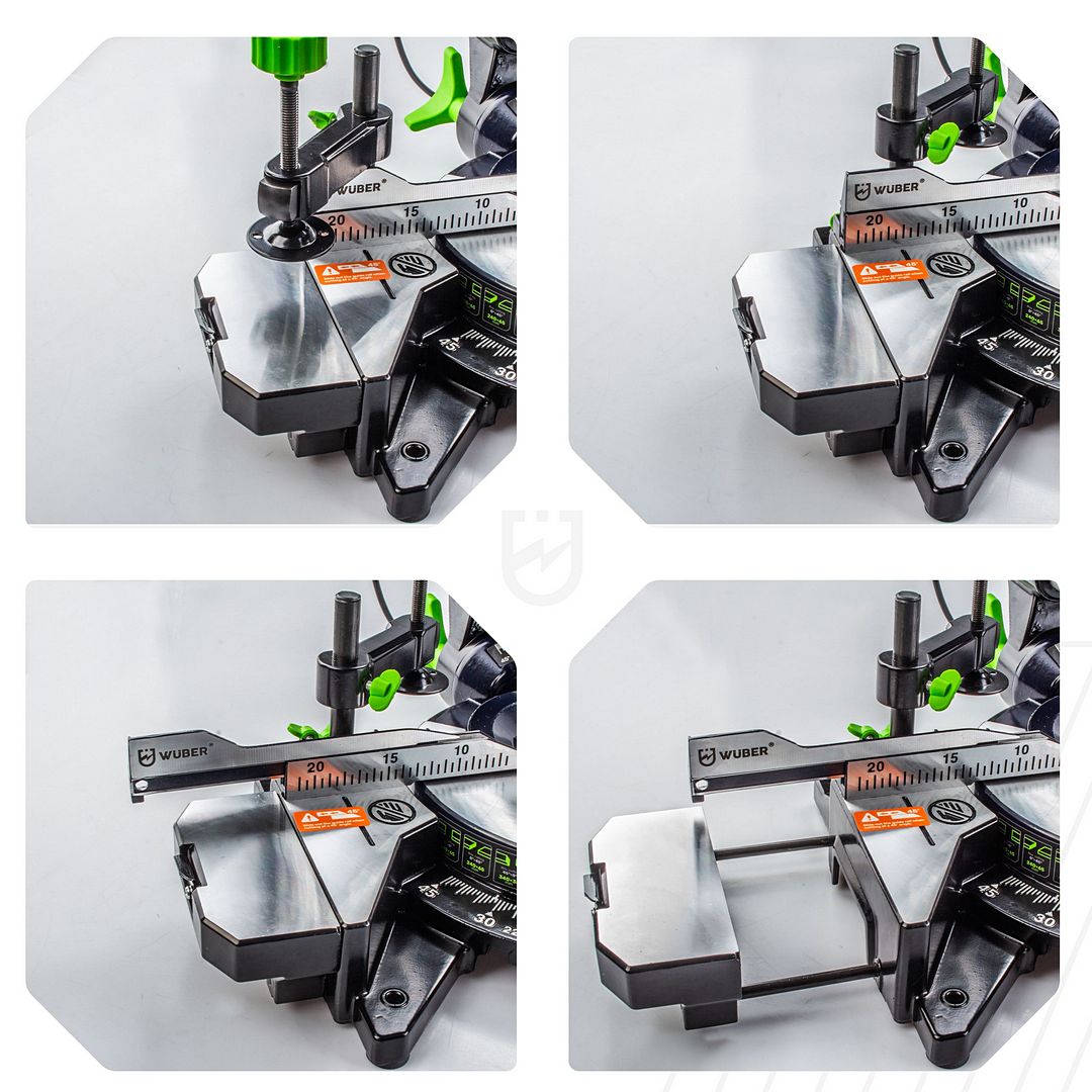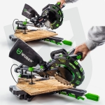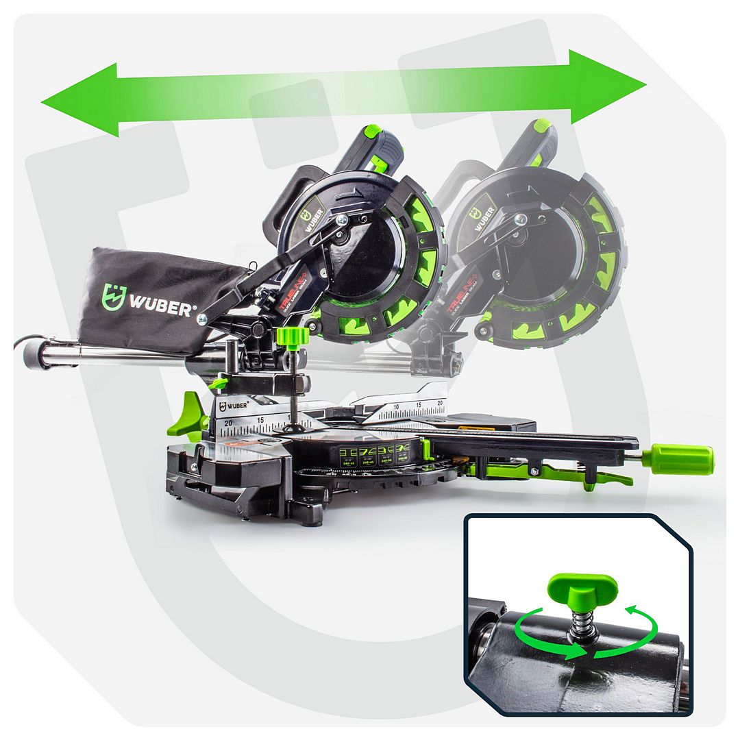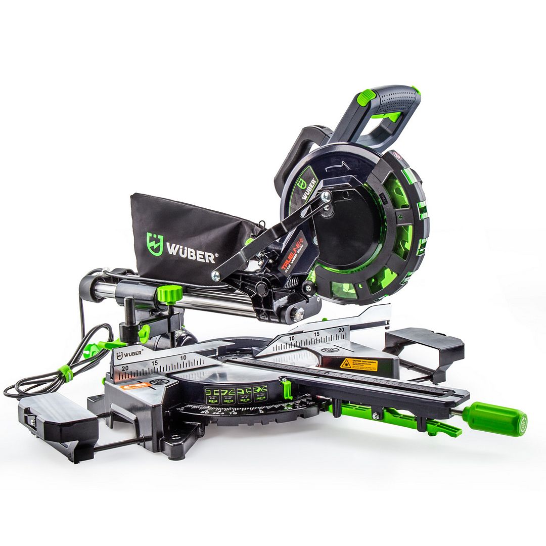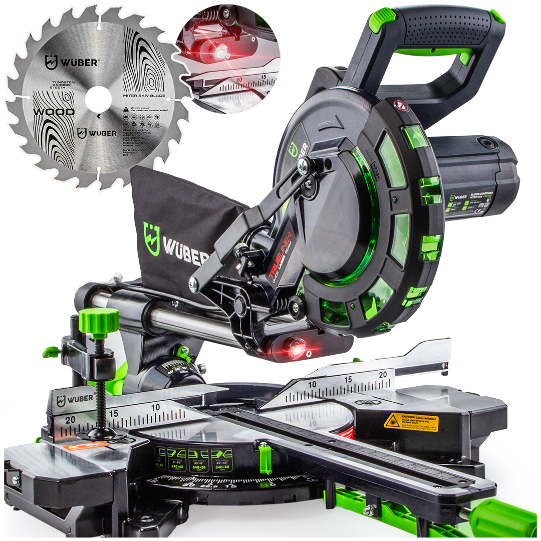 WUBER medienos padavimo kampinis pjūklas su lazeriu ir 210 mm disku.