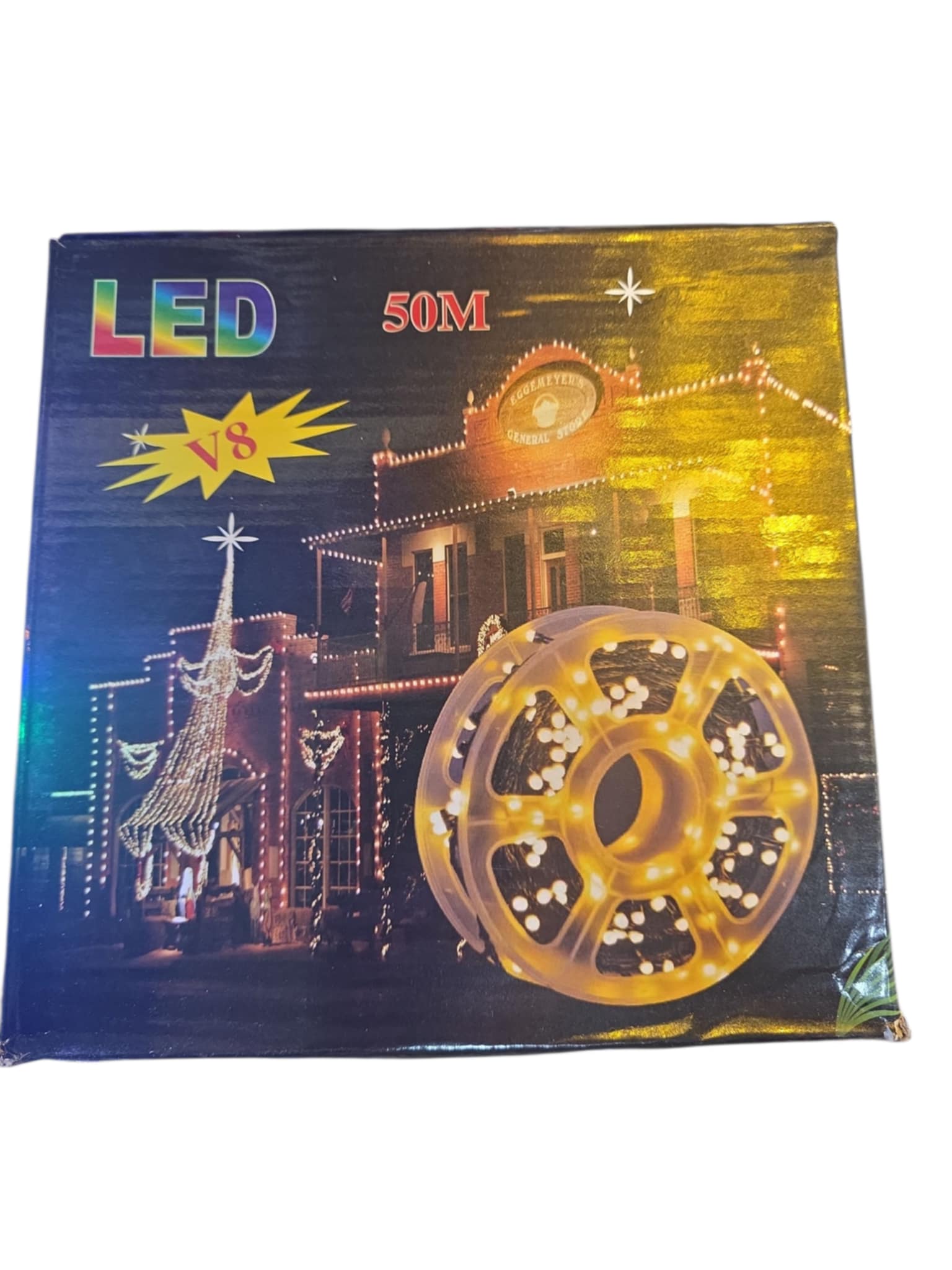 lgosios LED V8 dekoracinės girliandos yra puikus pasirinkimas norint sukurti šventinę, jaukią ar stilingą atmosferą tiek namuose, tiek lauke. Su įspūdingu 50 metrų ilgiu, šios girliandos idealiai tinka dideliems plotams, pastatų fasadams, medžiams ar ilgesnėms patalpoms dekoruoti. Pagrindinės Savybės ir Privalumai: Įspūdingas Ilgis: 50 metrų ilgio virvelė leidžia dekoruoti didelius plotus be papildomų sujungimų. LED Technologija: Naudoja energiją taupančias LED lemputes, kurios yra ilgaamžės ir saugios. Šalta Balta (Cool White): Suteikia modernų, ryškų ir švarų įspūdį.