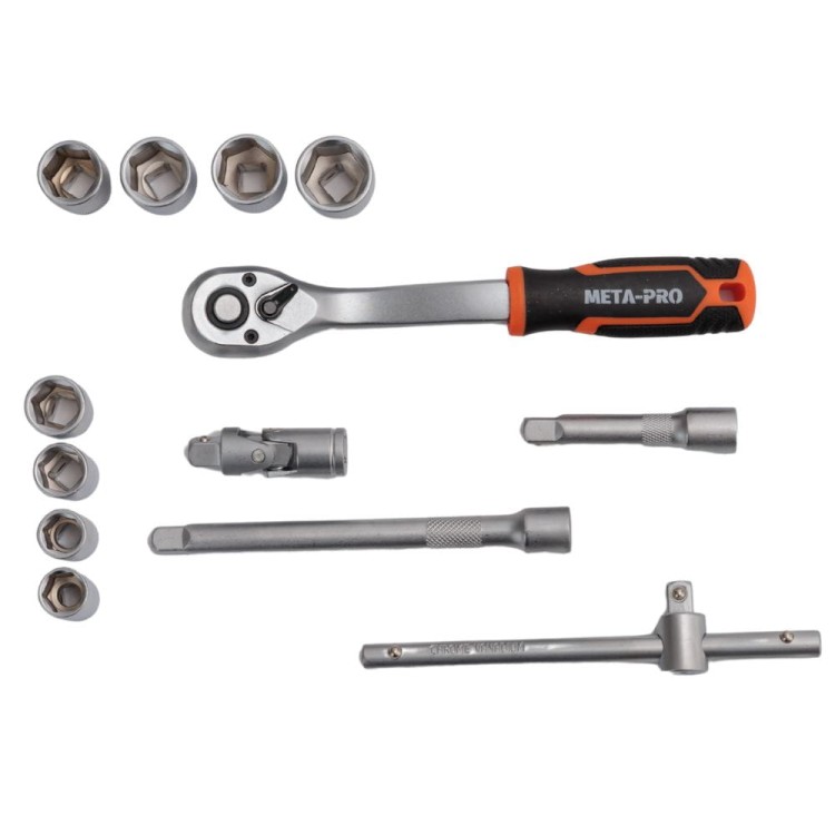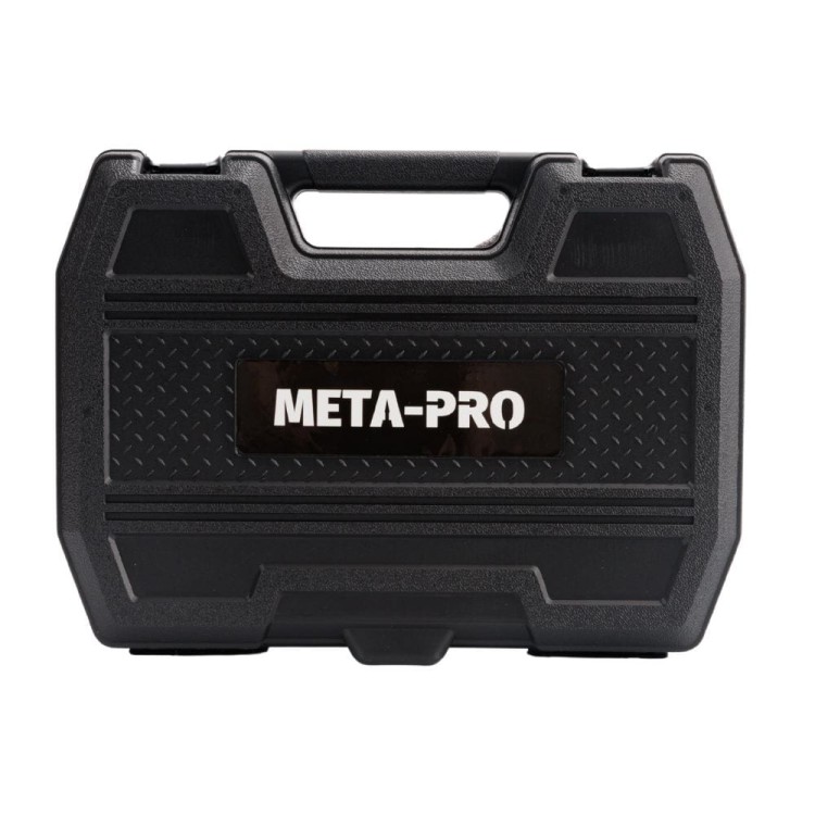 META-PRO galvučių rinkinys: 172 dalių galvučių ir terkšlinių raktų rinkinys. 24 dalių terkšlės sukimo žingsnis. Pagamintas iš chromuoto vanadžio plieno. Trys