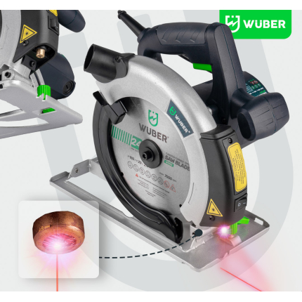 Produkto aprašymas „Wuber“ daugiafunkcis diskinis pjūklas medienai su lazerio funkcija   Pjūklu galima pjauti: medieną, fanerą, plastiką ir kt. Įrenginys
