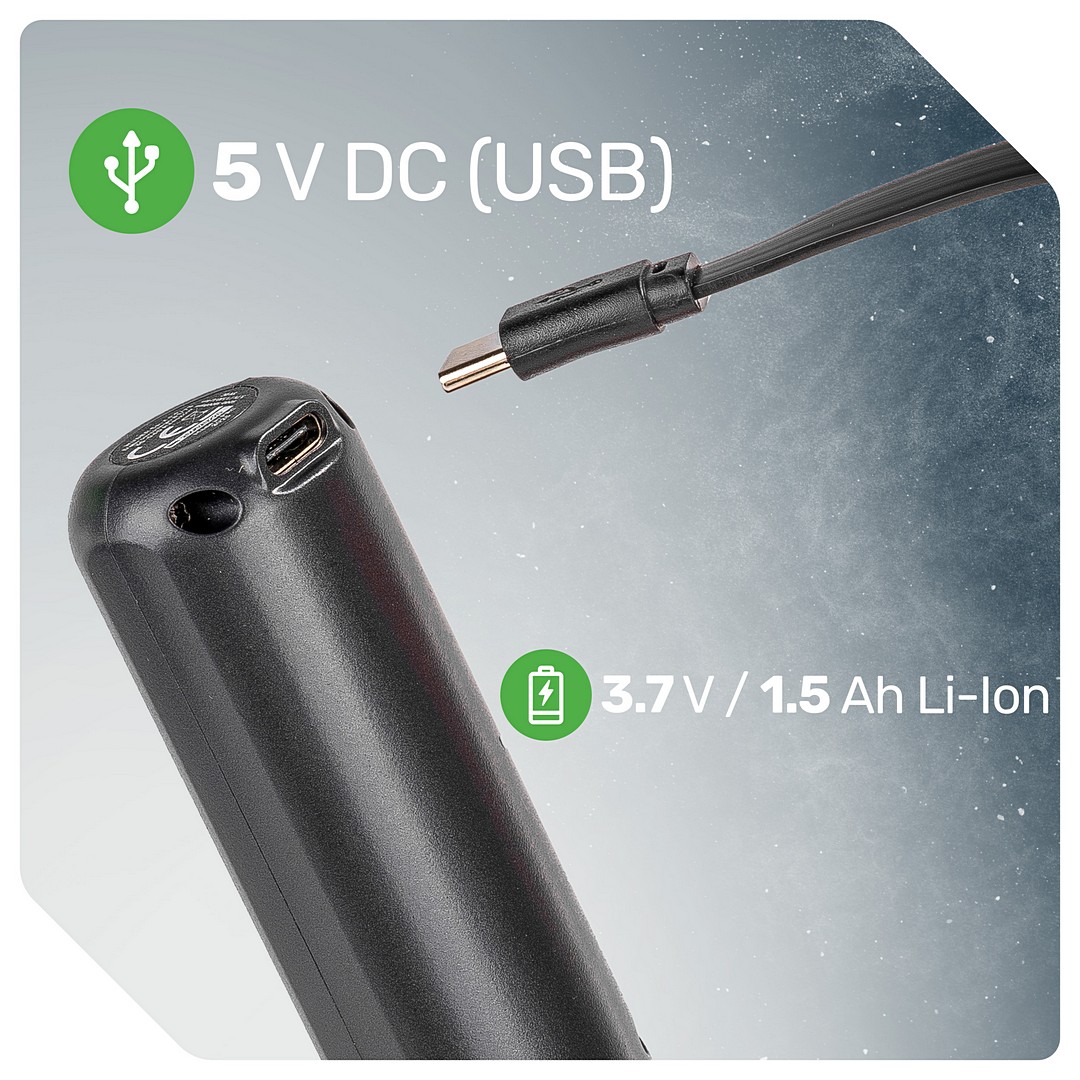 – Akumuliatorius: 3,7 V / 1,5 Ah ličio jonų