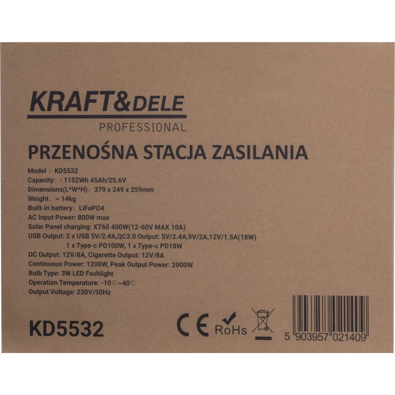KD5532 – tai pažangi nešiojama KRAFT&DELE elektros stotis, skirta reikliems vartotojams, kuriems reikalinga didelė galia ir visiškas energijos nepriklausomumas. Ji idealiai tinka avariniam energijos tiekimui namuose, kelyje, statybvietėse, stovyklaujant ar dirbant lauke. Tvirta konstrukcija ir dvi ergonomiškos rankenos, padengtos neslystančiomis putomis, užtikrina patogų ir saugų nešiojimą.