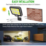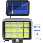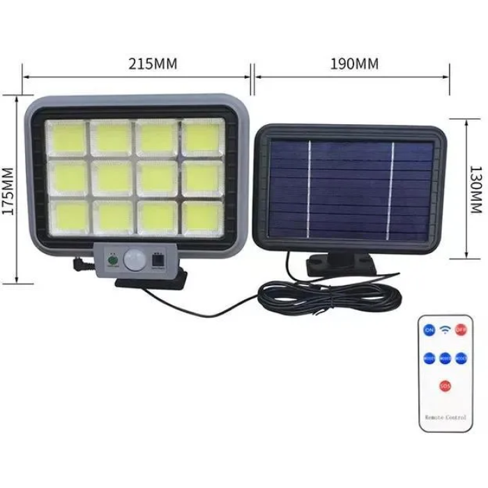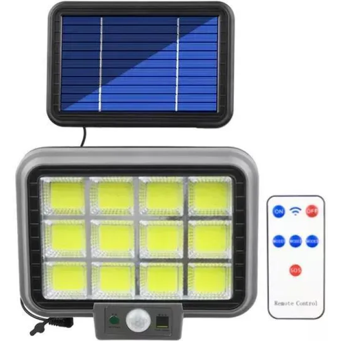 Saulės energija varomas sieninis šviestuvas su 3 veikimo režimais, turi nuotolinio valdymo pultą ir judesio bei prieblandos jutiklį, IP65 atsparumo vandeniui apsauga. Saulės energija varomas šviestuvas idealiai tinka naudoti priešais namą, apšviečiant įėjimo duris, vartus, namo sieną ir kt. COB LED moduliai pasižymi daug geresniu efektyvumu, palyginti su tradiciniais diodais. Savybės: Efektyvus saulės energija varomas šviestuvas su iki 160 LED 8 COB moduliuose su atskira saulės baterija yra neišsenkantis nemokamos energijos šaltinis jūsų namams. Įrenkite jį bet kur – saulės bateriją galite pakabinti 5 metrų atstumu nuo šviestuvo, o tai suteikia daug erdvės manevruoti. Sumažinkite lauko apšvietimo išlaidas, kartu rūpindamiesi ekologija – nereikia keisti baterijų. Dėl įmontuoto judesio ir prieblandos jutiklio jis įsijungs tik naktį ir tik tada, kai šviestuvas aptiks judėjimą aplink jį. Produkto specifikacija: