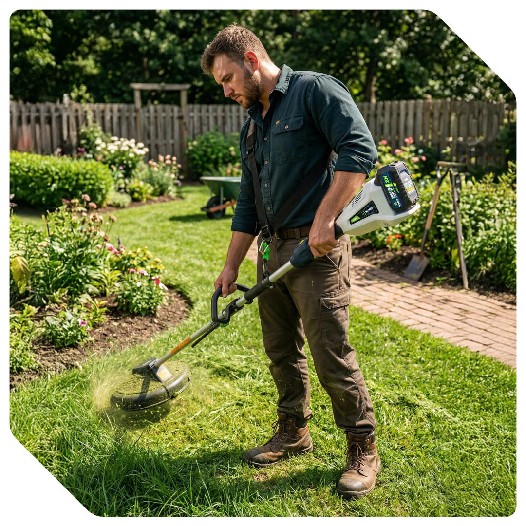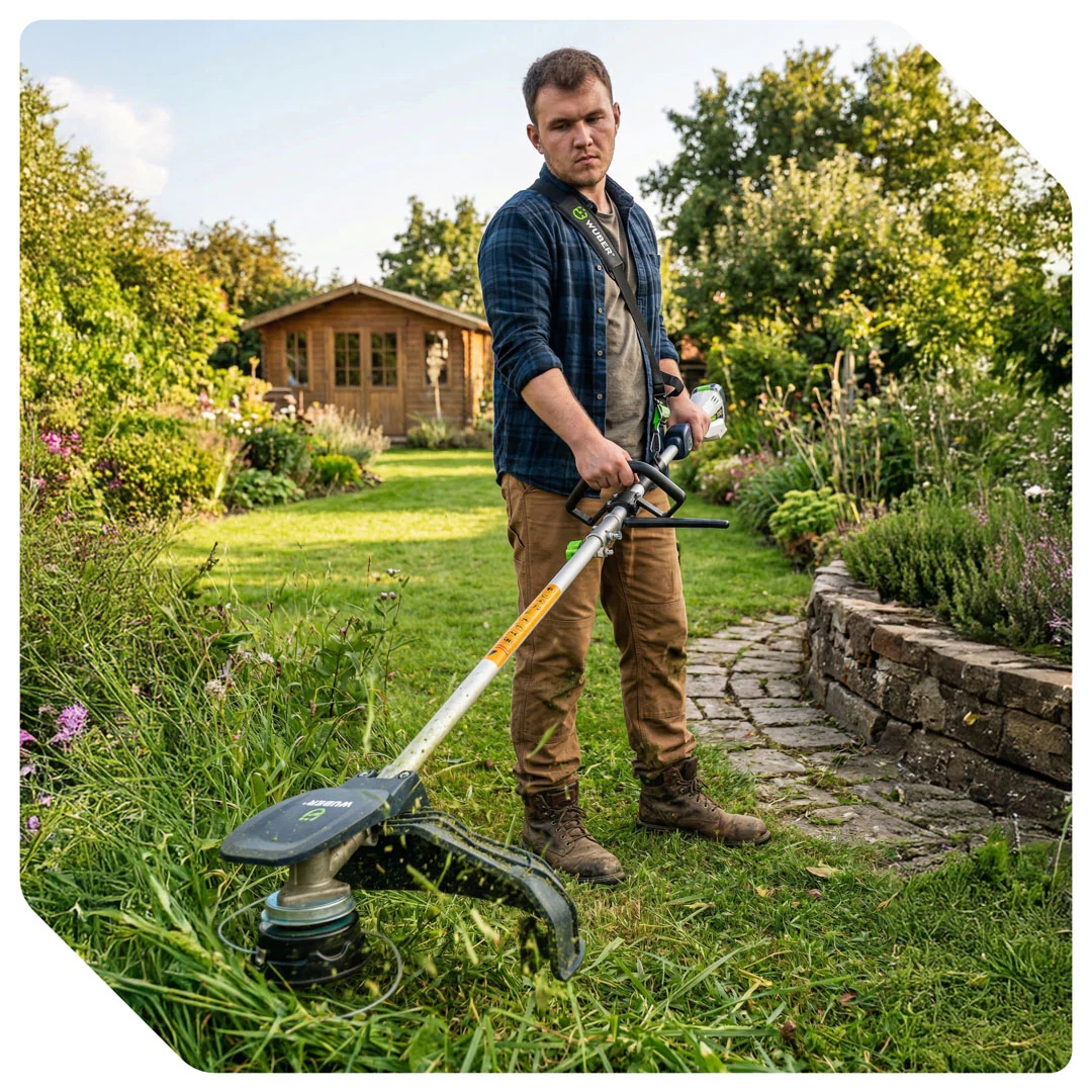 Dėl universalaus 2 viename dizaino su pusiau automatine „Tap & Go“ galvute ir keičiamais pjovimo peiliais, krūmapjovė efektyviai atlieka tiek vejos priežiūros, tiek sumedėjusių piktžolių pjovimo užduotis.