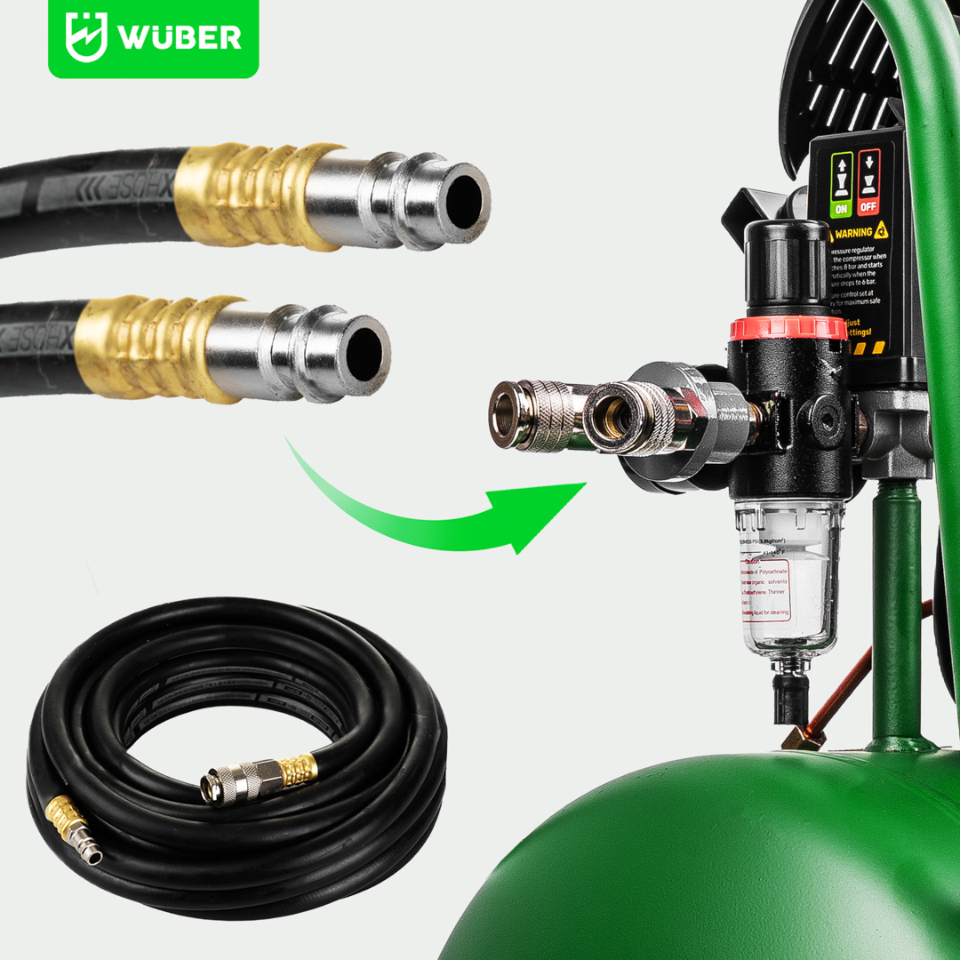 Du vožtuvai ir standartinė 1/4 colio jungtis sukuria universalų sprendimą, suderinamą su dauguma pneumatinių įrankių.