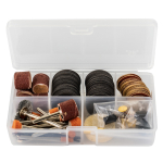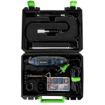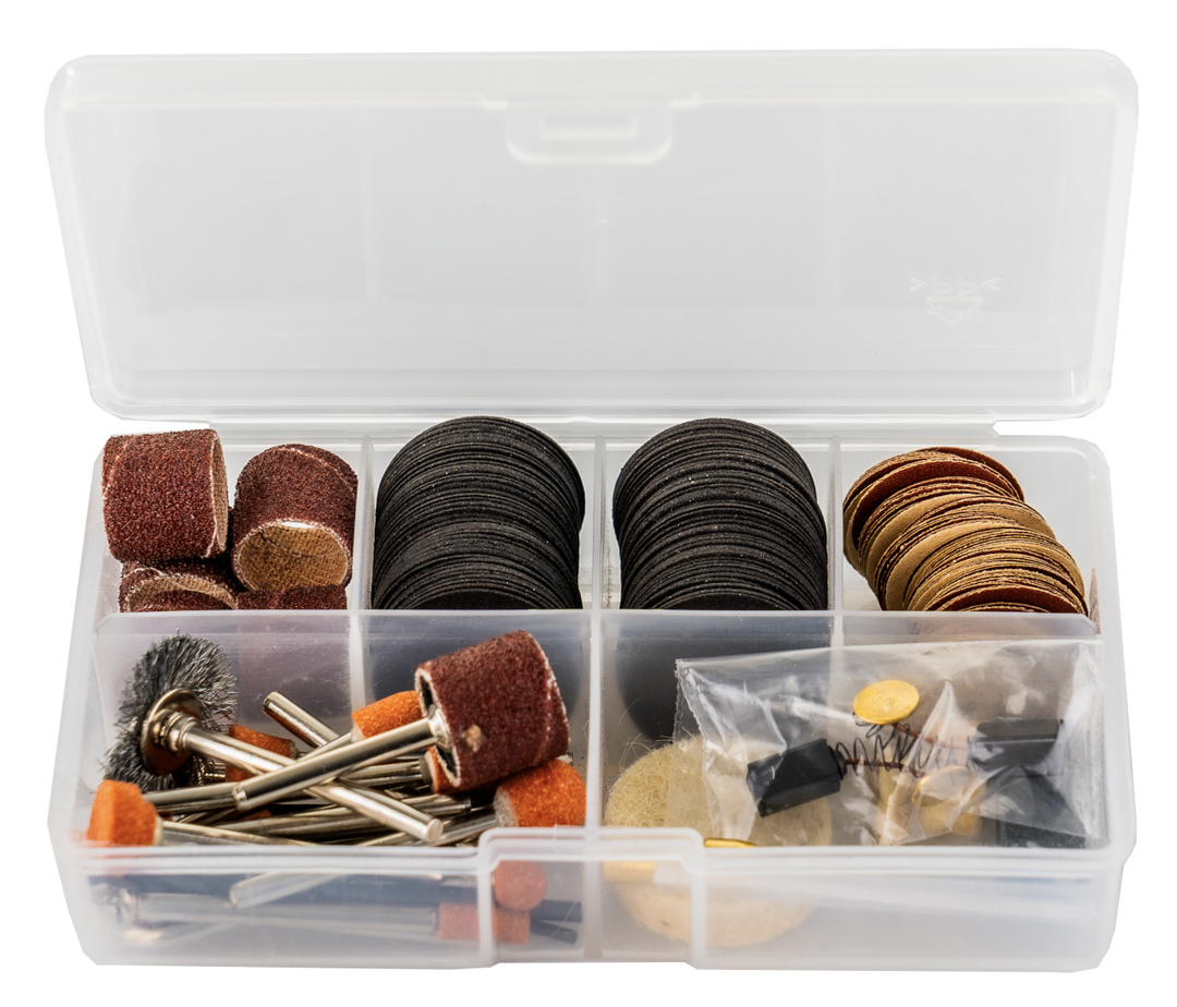 Šlifuoklis komplektuojamas su išsamiu priedų rinkiniu, o visas rinkinys supakuotas tvirtame nešiojimo dėkle.