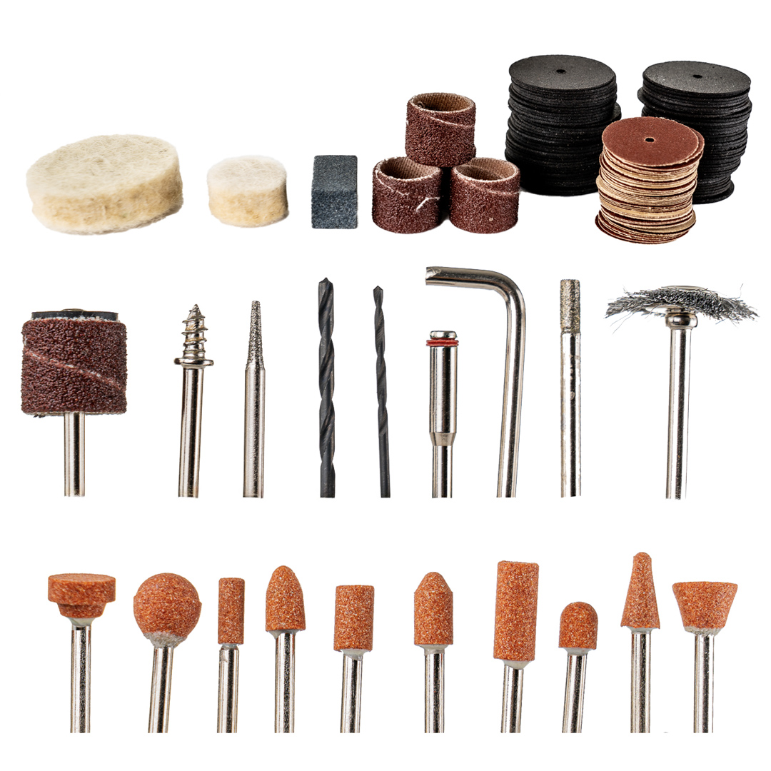 Priedai 200 vnt. (pjaustytuvai, diskai, šlifavimo diskai, galąstuvas, poliravimo diskai, grąžtai, šepetys) Aiškios instrukcijos lenkų kalba Nešiojimo dėklas
