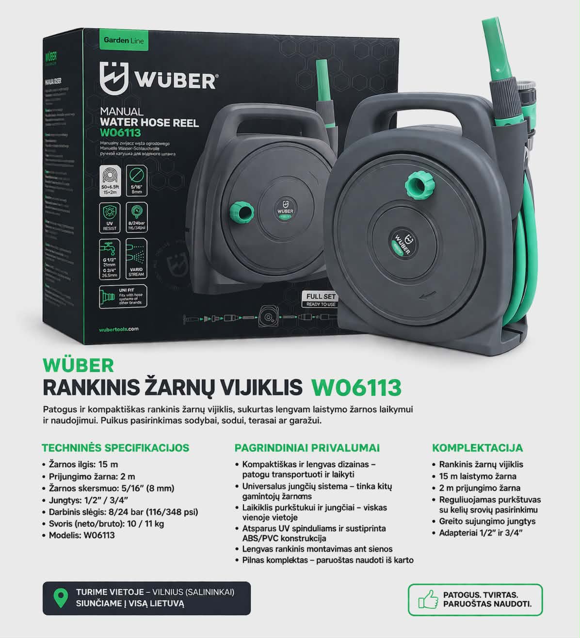 WÜBER rankinis žarnos vijiklis, skirtas patogiam laistymo žarnos laikymui ir naudojimui. Puikiai tinka sodui, kiemui, terasai ar garažui – padeda palaikyti tvarką ir apsaugo žarną nuo susisukimų. Lengvas, tvirtas ir iš karto paruoštas naudojimui.