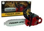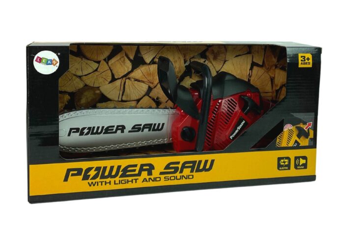 Realistiško dizaino žaislinis grandininis pjūklas su garsu ir judančiais elementais.